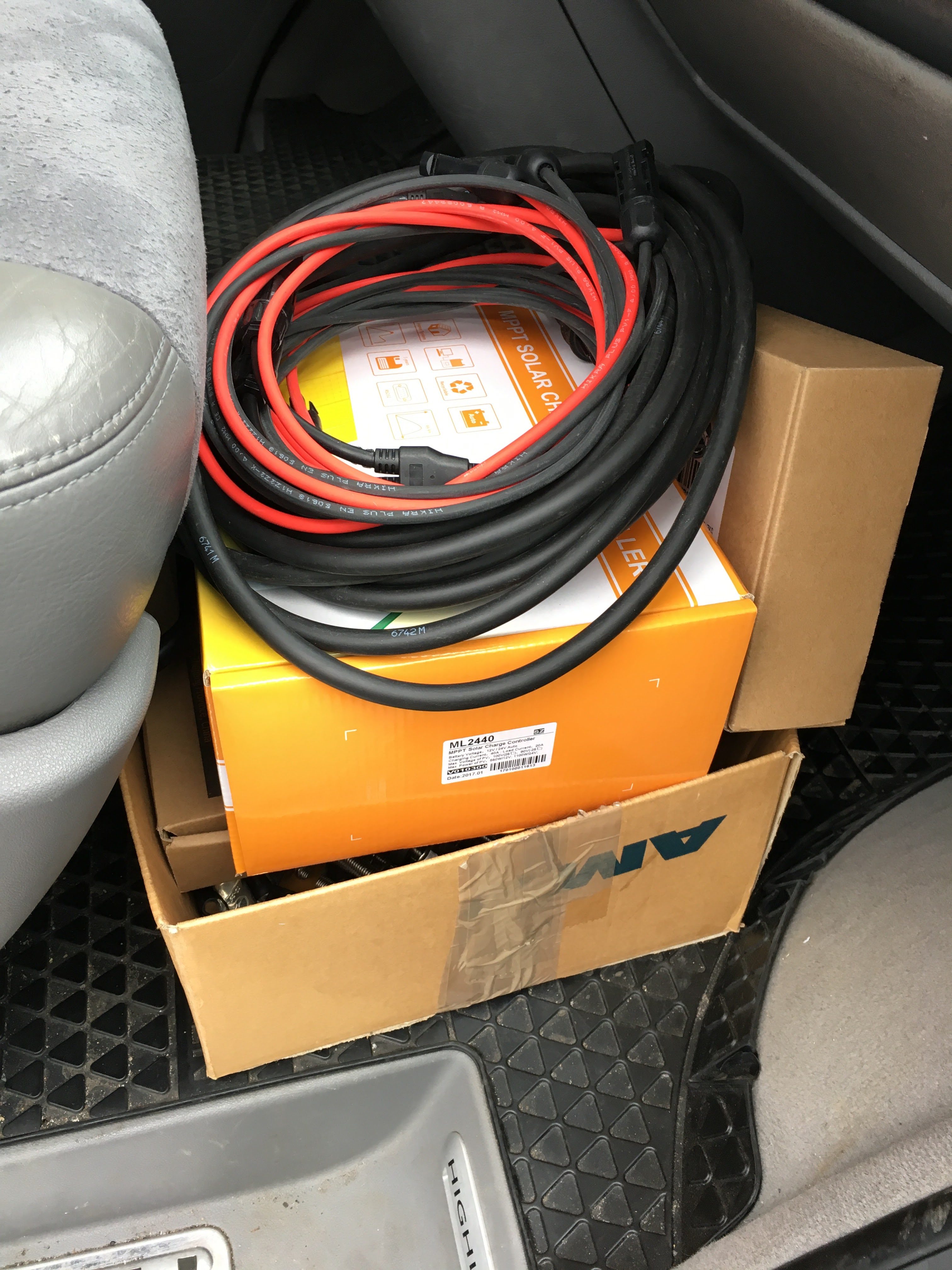 12.04.2017 – Solarpanels, Geräte und Kabel per Spedition angeliefert. (Ohne Vorankündigung. 2 Minuten später und Lieferung hätte nicht mehr zugestellt werden können, da ich gerade fahren wollte)