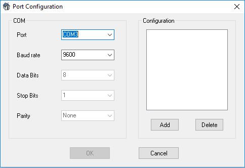 Nach erfolgreichem Login über „Communication -> Port Configuration“ den lokalen COM Port definieren und auf add klicken.