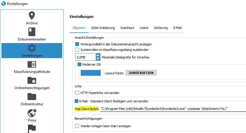 Damit mit ecoDMS auch über Thunderbird Anhänge verschickt werden können, muss in den Einstellungen ein Mail Client Befehl hinterlegt werden.